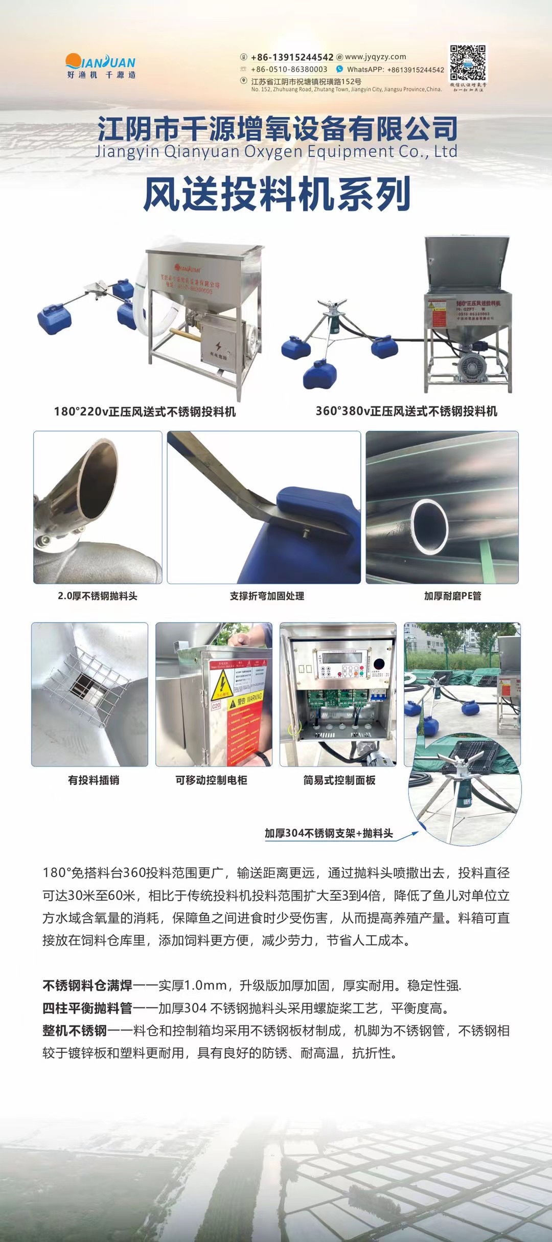 主要产品:变频增氧机、底部微孔增氧机、正压风送式投料机、传统齿轮增氧机、轻便型变频水泵、罗茨风机、漩涡风机、曝气盘、曝气管、双层新料自沉管、气提推水增氧机、太阳能增氧机、循环流水槽成套设备等。也可根据客户需求定制个性化产品。